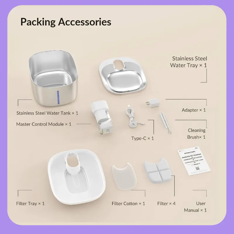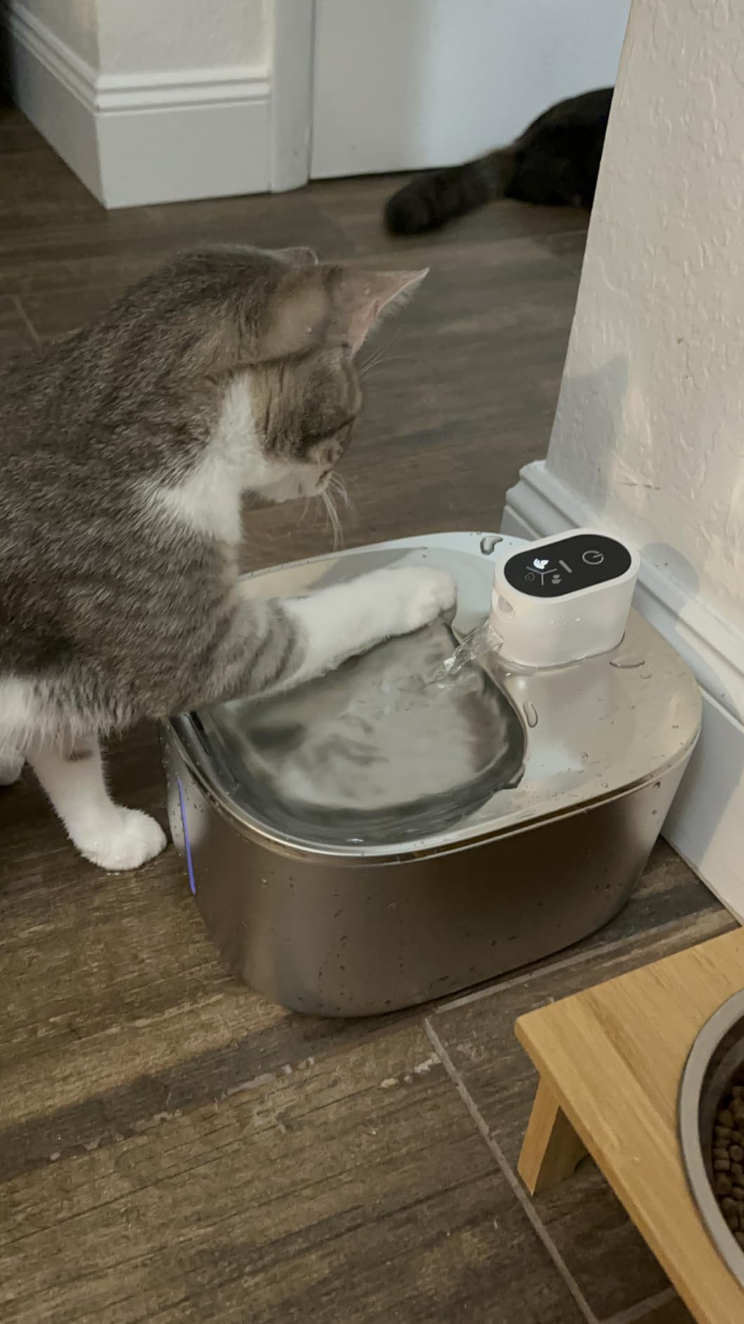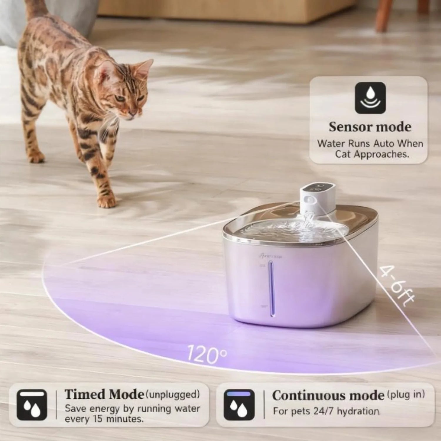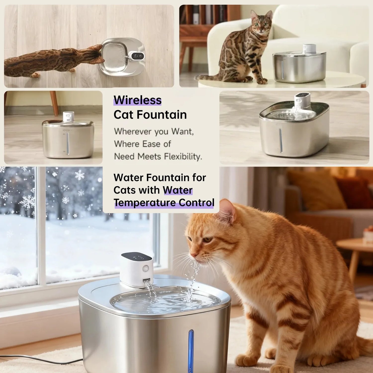 Wireless design, Set it anywhere, no wires to trip or be chewed. A built-in 4000mAh rechargeable battery, this stainless steel cat fountain provides your dogs and cats with fresh, clean water for up to 60-100 days.