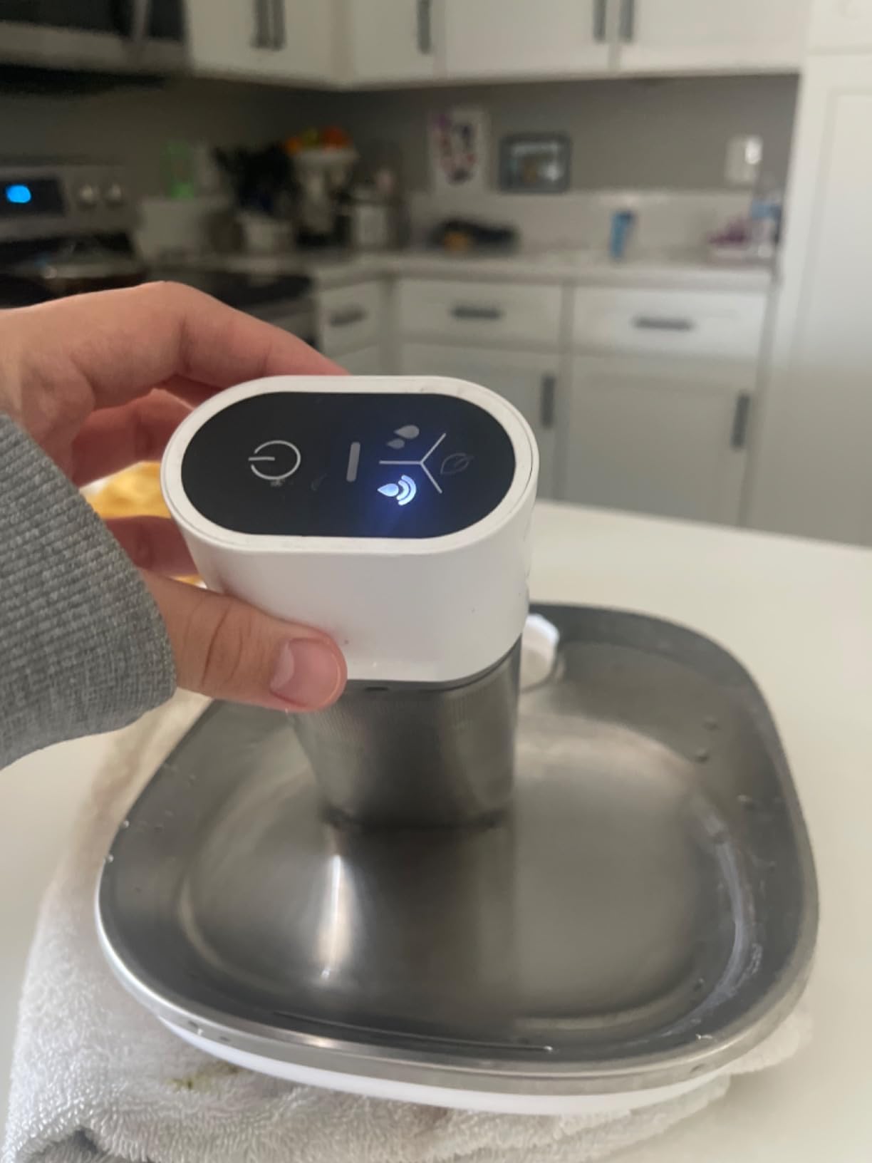 Cordless pet water fountain with advanced sensor releases a 12s flow when senses your cat within 4-6 ft/120°, preserving power while encouraging your pet to take a sip. Easy to operate, just one button to switch between 3 work modes: sensor mode, timing mode, continuous mode. 135fl oz /4L Capacity allows a dog or two cats to "binge drink" for 15 days!